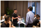 郑旭以《如何与伟大的企业共同成长》为题,分析了当今世界政治经济形势,从企业讲到员工,并详细讲解了“飞马旅行社”和“最佳员工变成了落后干部”两个生动的案例,与现场学员亲切互动。